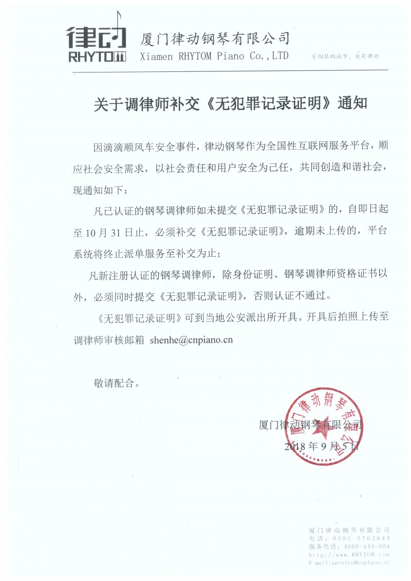 凡已认证的钢琴调律师如未提交《无犯罪记录证明》的,自即日起至10月30日止,必须补交《无犯罪记录证明》,逾期未上传的,平台系统将终止派单服务至补交为止;