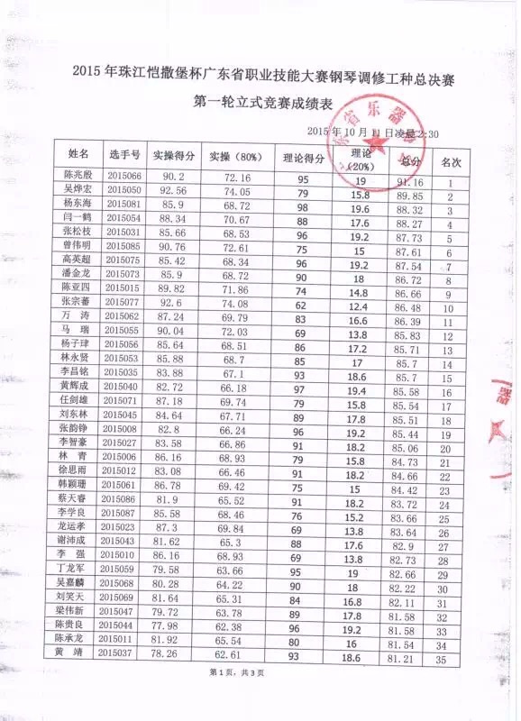 2015年珠江恺撒堡杯广东省职业技能大赛钢琴调修工种总决赛第一轮立式竞赛成绩